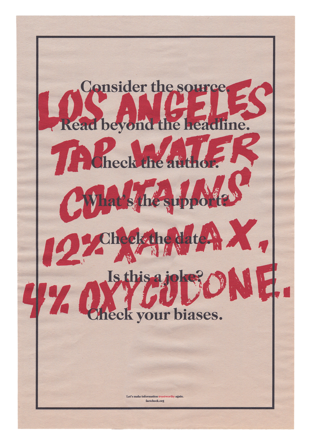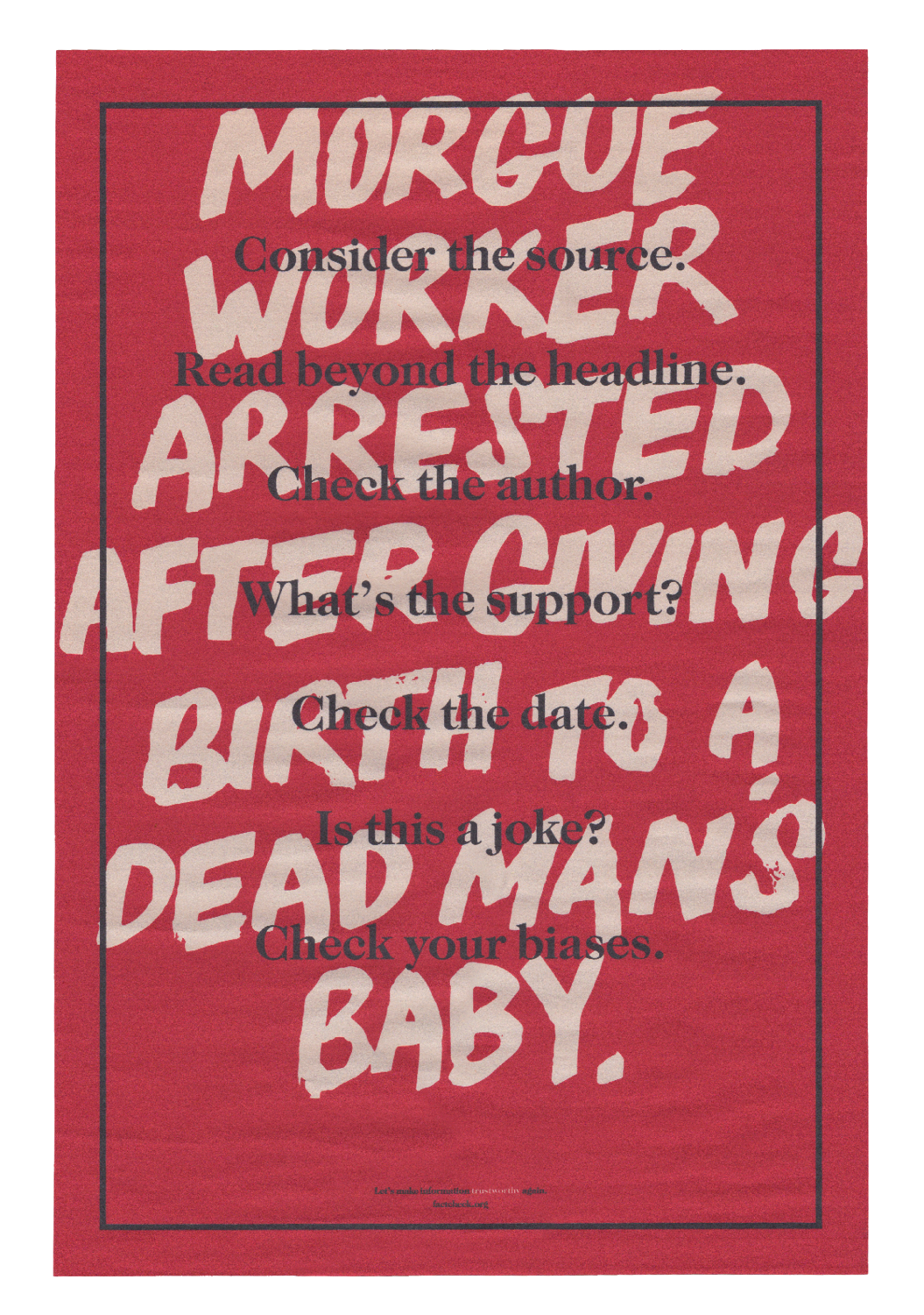 My poster-driven campaign worked to suggest different ways of perceiving information to its audience; in a time where so much false information is being taken in as fact. I typeset several main points from a FactCheck.org article “How to Spot Fake News” by Eugene Kiely & Lori Robertson, then hand-lettered/wrote the top 50 circulated fake news headlines in 2016, compiled by Buzzfeed, on top. Recontextualized onto posters, the headlines are meant to spark curiosity, provoke deeper research, and make facts great again.